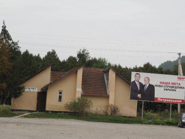Вже тривалий час поблизу туалету на місцевому автовокзалі розміщений бігборд, на якому кандидат міцно тисне руку своєму лідеру Віталію Кличку.