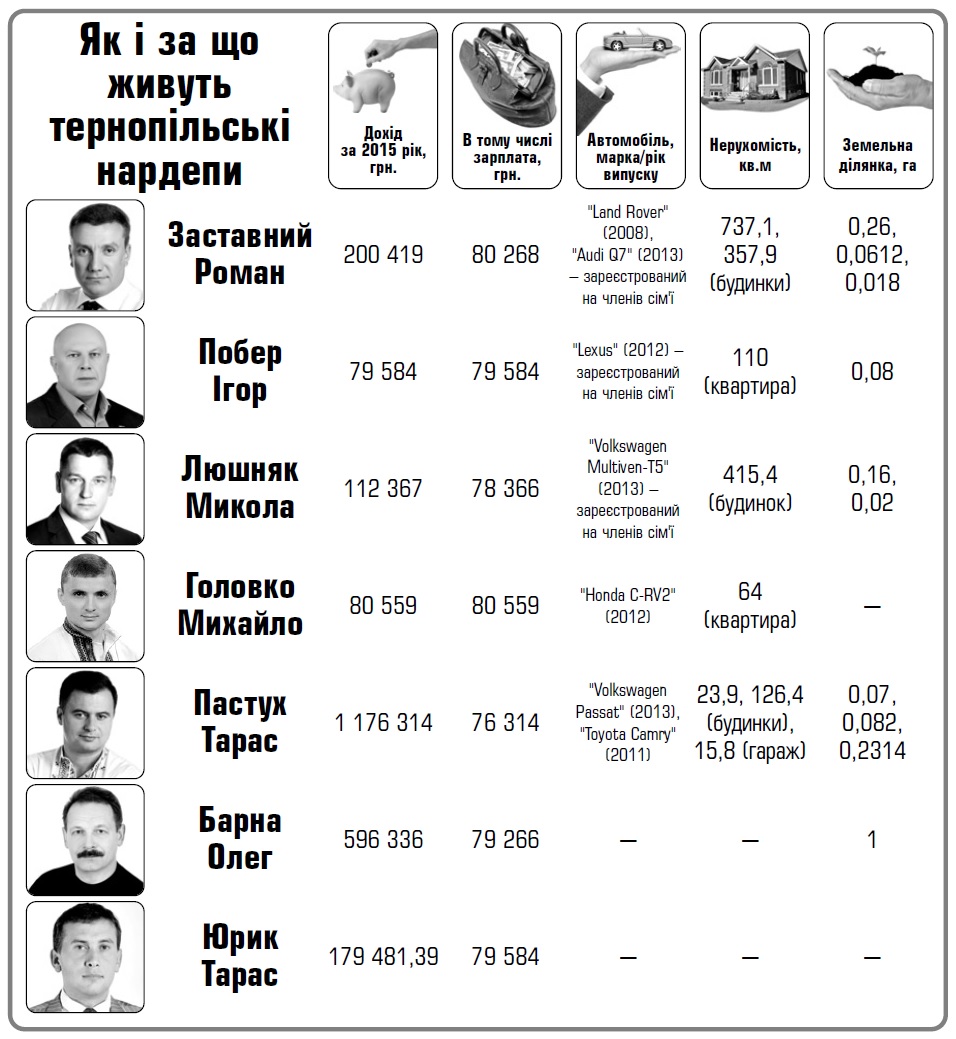Аналіз декларацій тернопільських нардепів засвідчує, що троє з семи родин обранців заробили в 2015 році понад мільйон гривень. На противагу родини двох слуг народу не мають ні власного помешкання, ні транспорту.