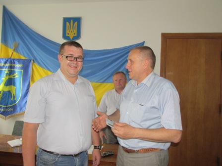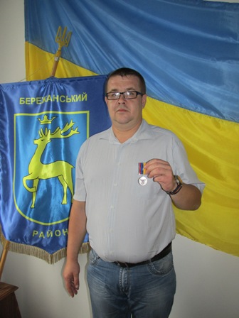 Голова Бережанської райдержадміністрації В. Петровський вручив нагрудний знак «Учасник АТО» начальнику відділу ведення Державного реєстру виборців райдержадміністрації Легкому Ростиславу Сергійовичу.