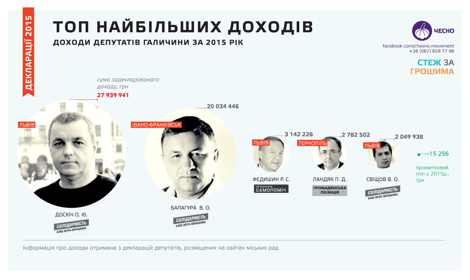Активісти сформували рейтинг галицьких багатіїв із найвищими доходами та з найбільшими статками. Інформацію взято із депутатських декларацій за 2015 рік.