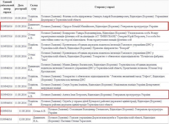 Тернопільський юрист, голова Юридичного центру «Конфіденс» Віктор Козелко оприлюднив на своїй сторінці у Facebook знайдені в реєстрі судових справ позовні заяви Сідорова, Антюка та Соколишина.