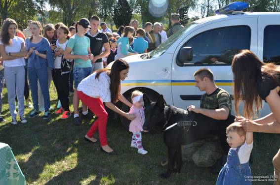 Після урочистої лінійки тернопільські поліцейські продемонстрували школярам зброю та спецзасоби, а чотирилапий помічник правоохоронців вівчарка Річчі своїми вміннями привела у захват і первачків і старшокласників.