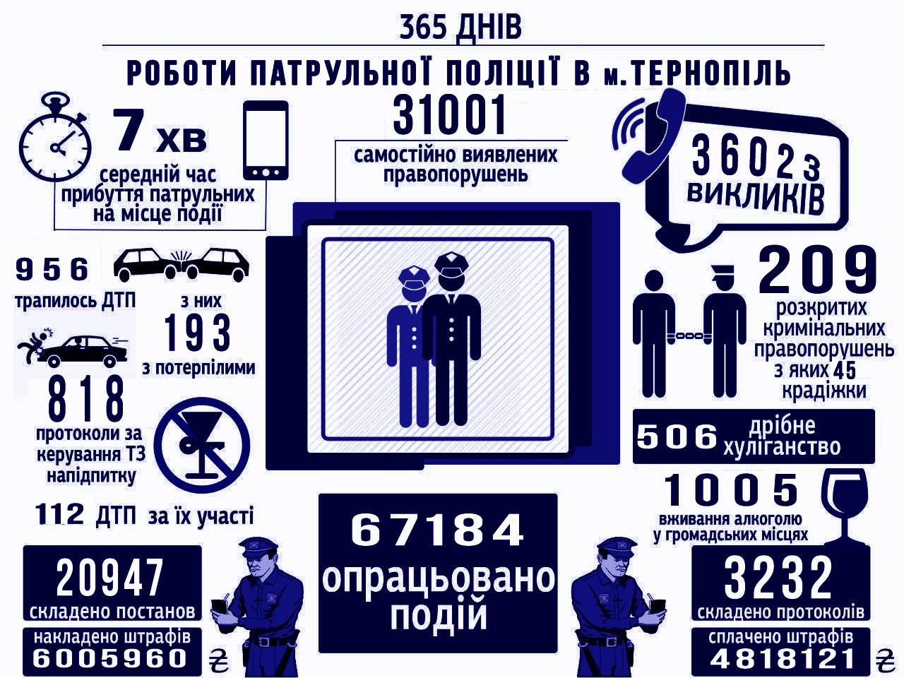 Від початку своєї роботи патрульні поліцейські Тернополя склали 3235 адмінпротоколи, з них протоколи за станом алкогольного, наркотичного чи іншого сп’яніння – 818. (статті за якими більшість складено протоколів 130, 124, 127, 173, 185, 178 КУпАП – Кодексу України про адміністративні порушення)
