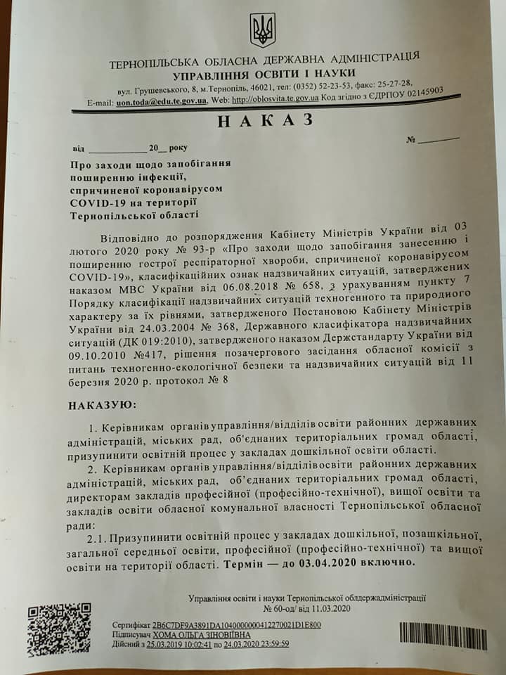 Освітній процес призупинений в зак4ладах дошкільної, позашкільної, загальної середньої освіти, професійної (професійно-технічної) та вищої освіти на всій території Тернопільської області.