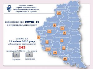 Станом на 12 квітня 2020 року в Тернопільській області за результатами досліджень методом ПЛР – у 243 випадках діагноз лабораторно підтверджений (218 випадків – дорослі, 25 випадків – діти), з них 5 летальних.